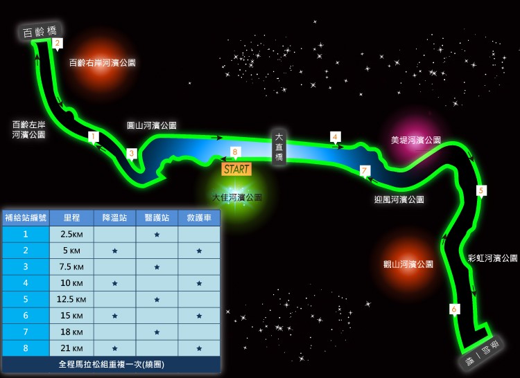 | 報到 物品 | 大會紀念衫、晶片號碼布、(星光組無晶片)、寄物卡、LED手環 | |||